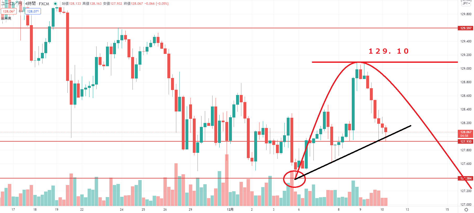 短期ポイントは高値129.10、そして安値は起点の127.38です。