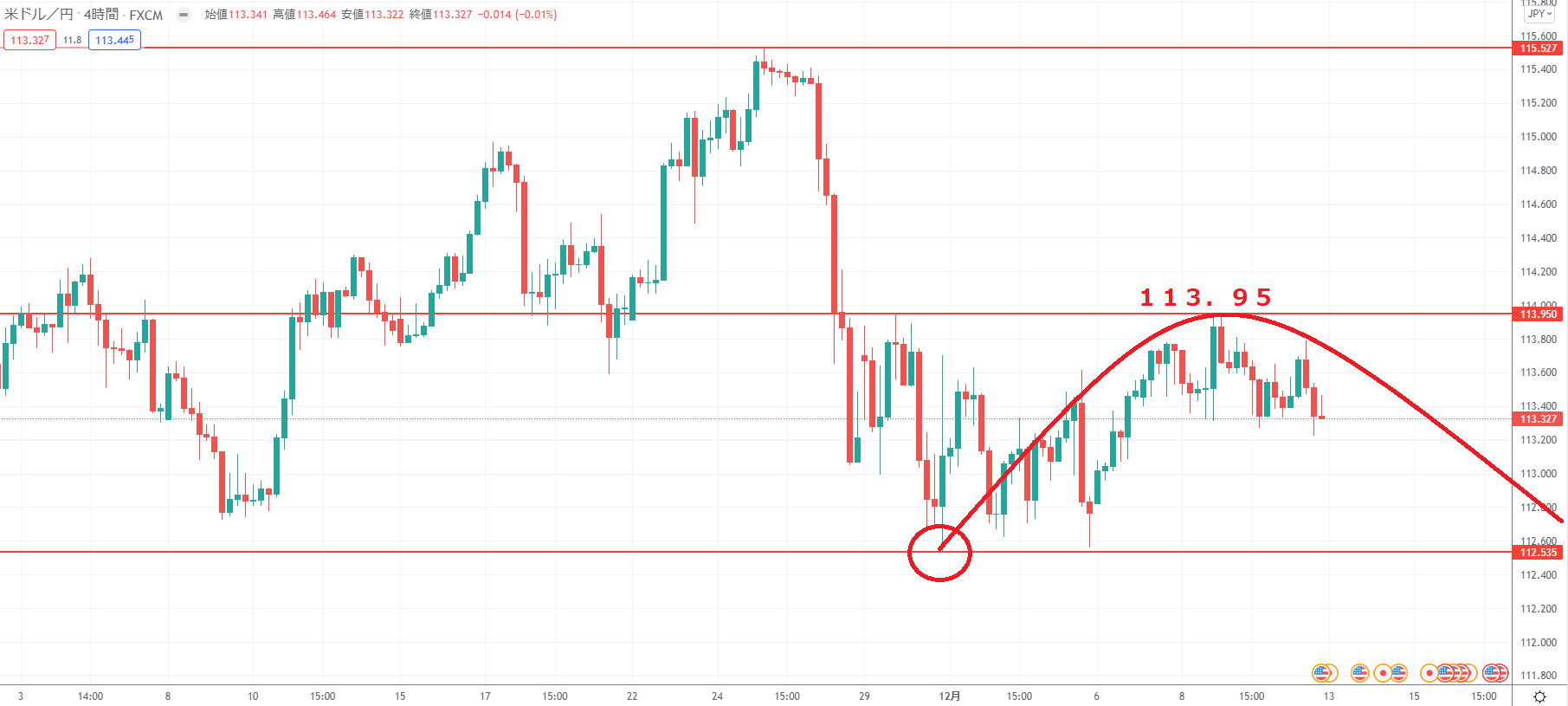 そして、水曜日高値113.95から、高値切り下げる展開が続いています。
