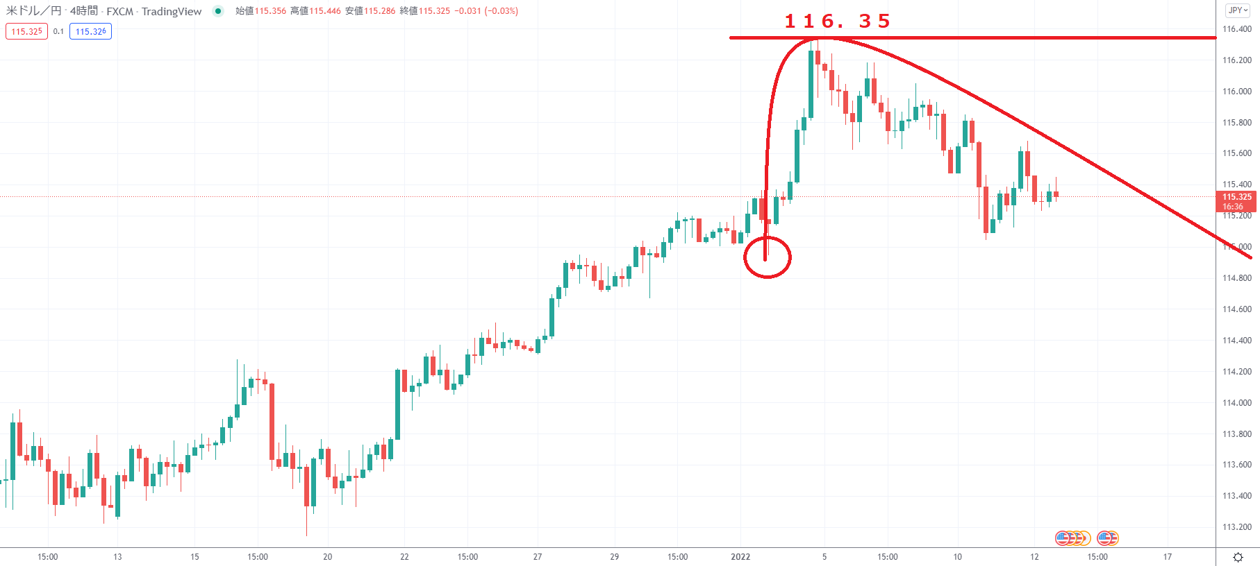 このまま上昇なければ天井は116.35のポイントですね。