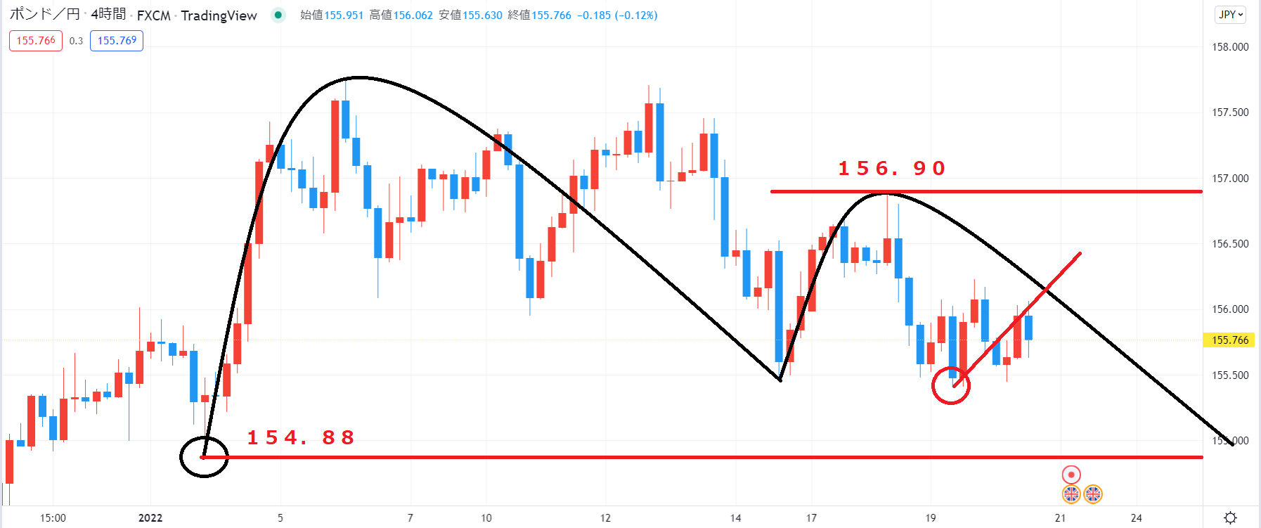 赤のシナリオの場合は現在8本目ですので、安値155.40からの上昇に注意が必要です。