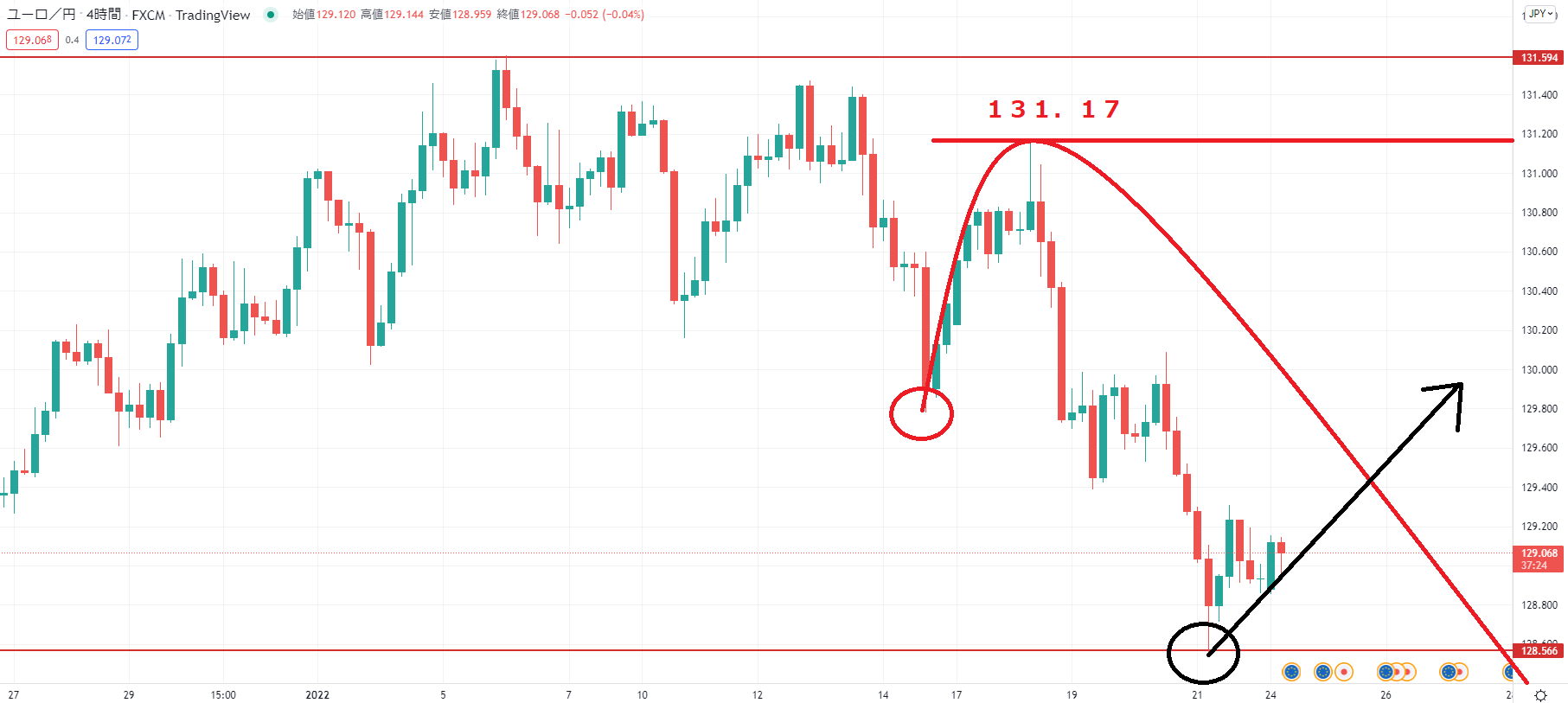 ロングエントリーは128.56に近いポイント、ショートエントリーは131.17手前まで戻すことがあればチャレンジしていきたいですね♪