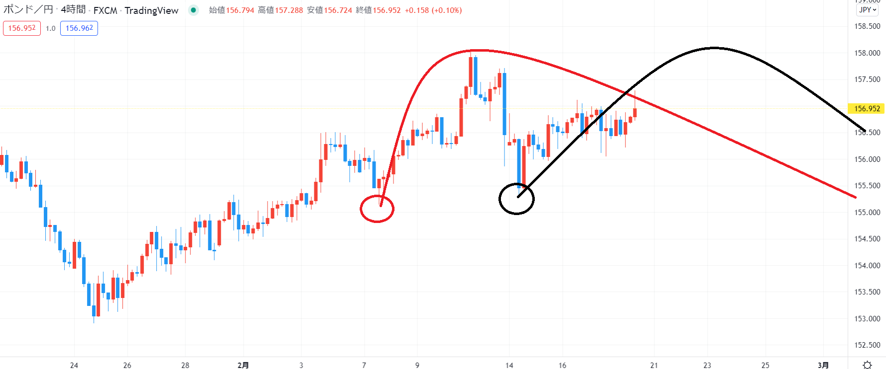 直近高値ポイントは本日の高値、157.28、超えた場合は158.06が次のポイントとなります。