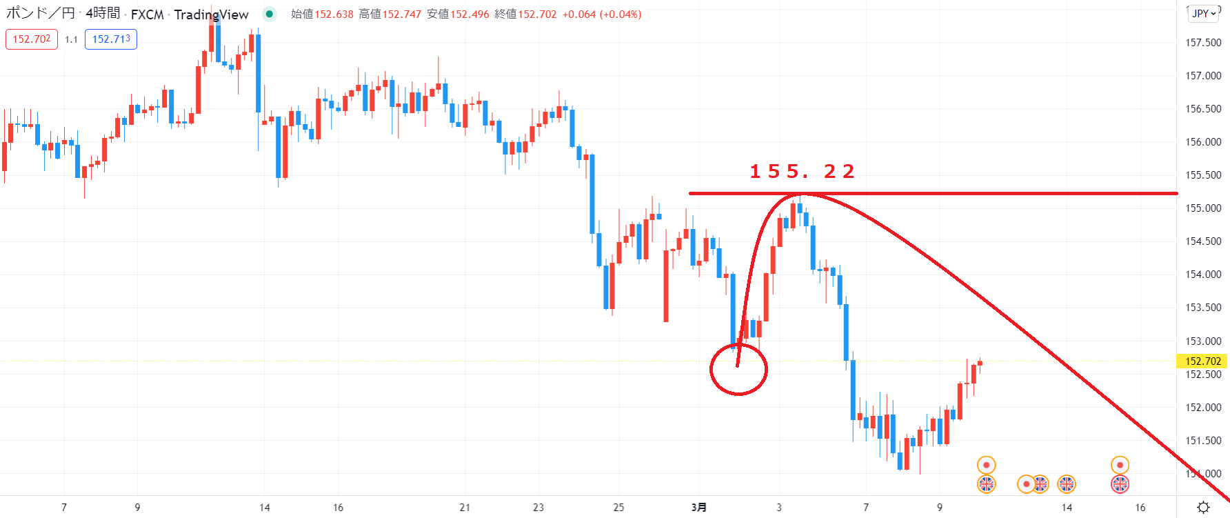 まずはこの155.22が分岐点となりますのでこのラインを超えずに下落出来るかに注目していきます。