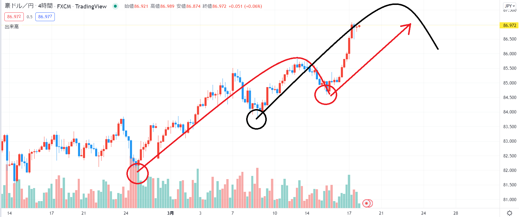 そして、週足の直近高値86.25のポイントも上抜けましたので強い上昇トレンドが続いていることが分かりますね。