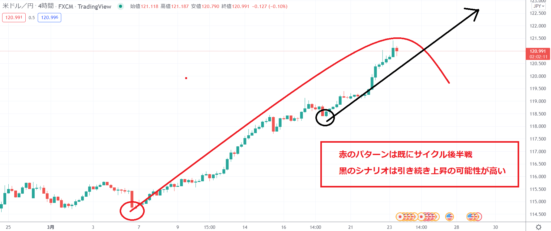 メジャーサイクルがはっきりしない中、4Hサイクルについても、赤、または黒のシナリオを想定しています。