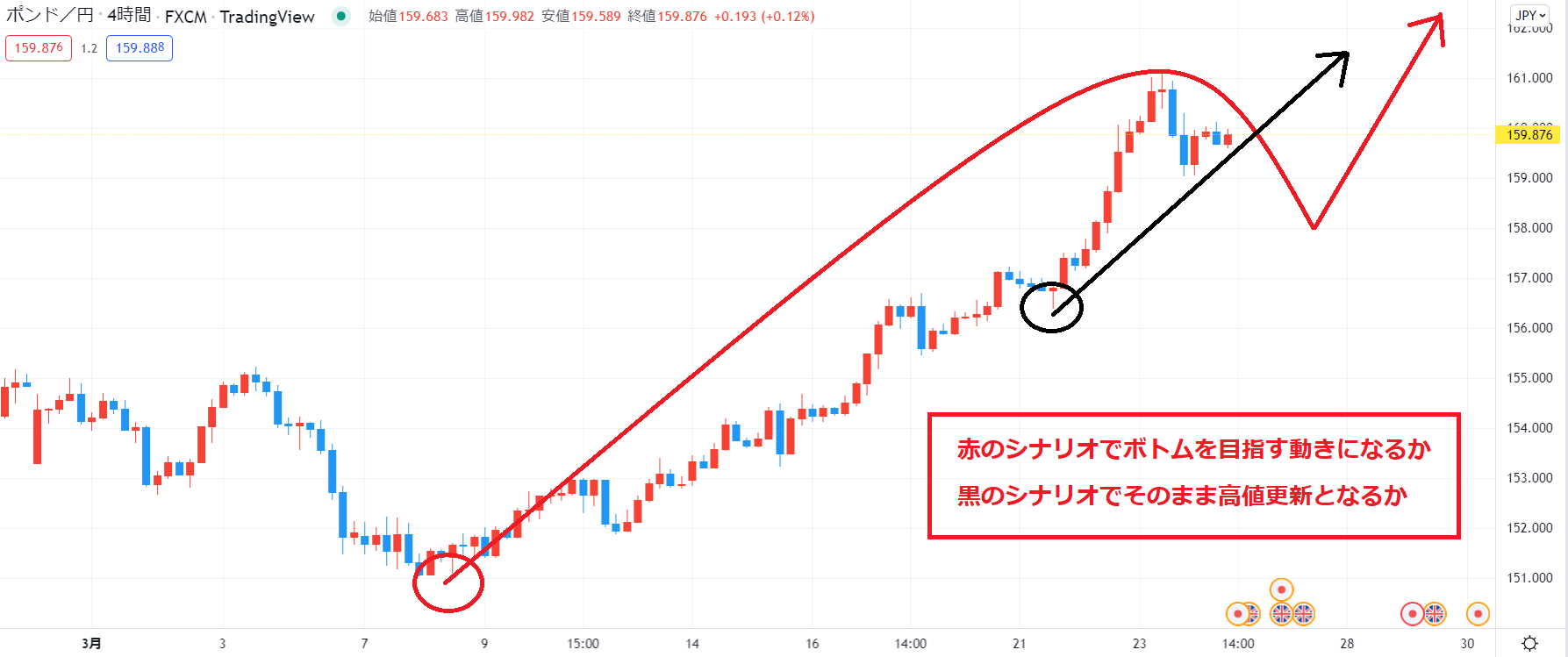 そして、高値更新の場合はポジションは持たず、黒のシナリオの可能性に繋げていきます。