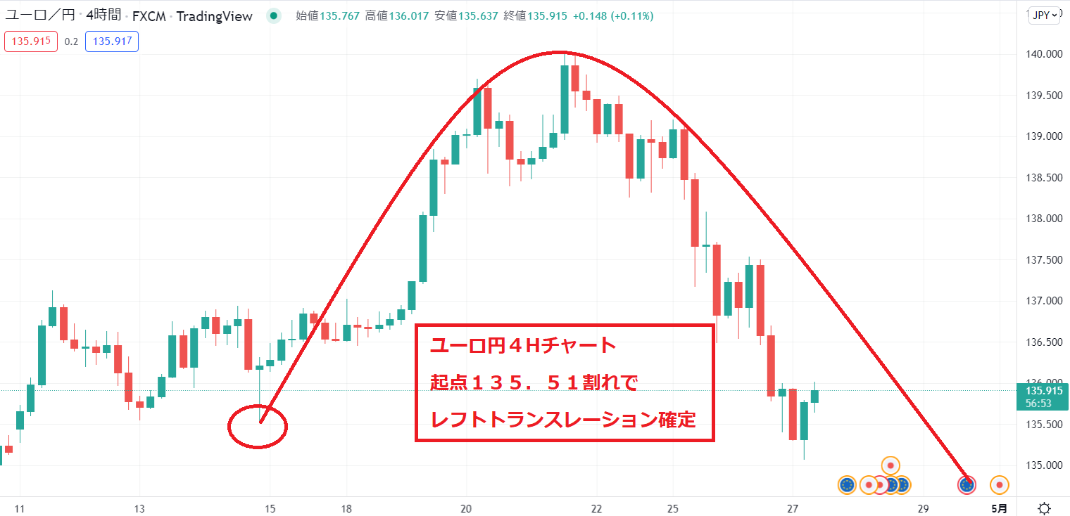ユーロ円も意識されていた起点135.51割れになりましたのでレフトトランスレーション確定のシナリオです。