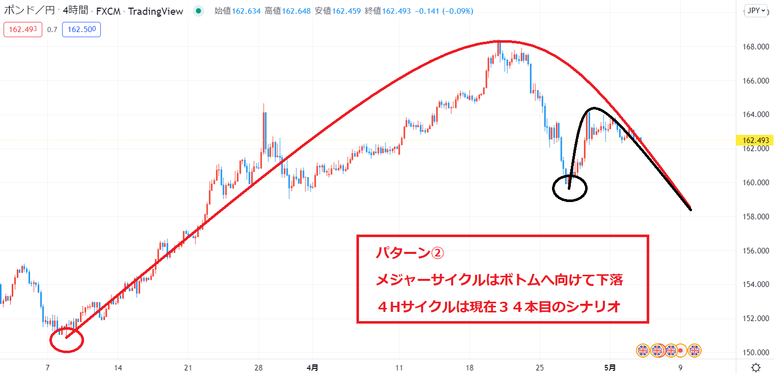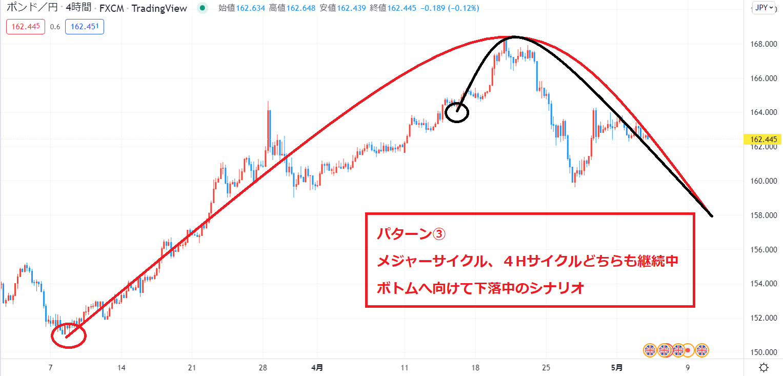 サイクル延長の可能性もありますので、このシナリオの可能性が0ではありませんが、直近でボトムをつけない場合はパターン①、パターン②の可能性が高い状況です。
