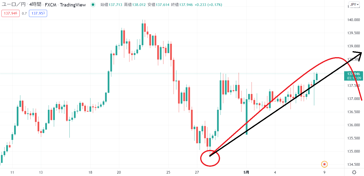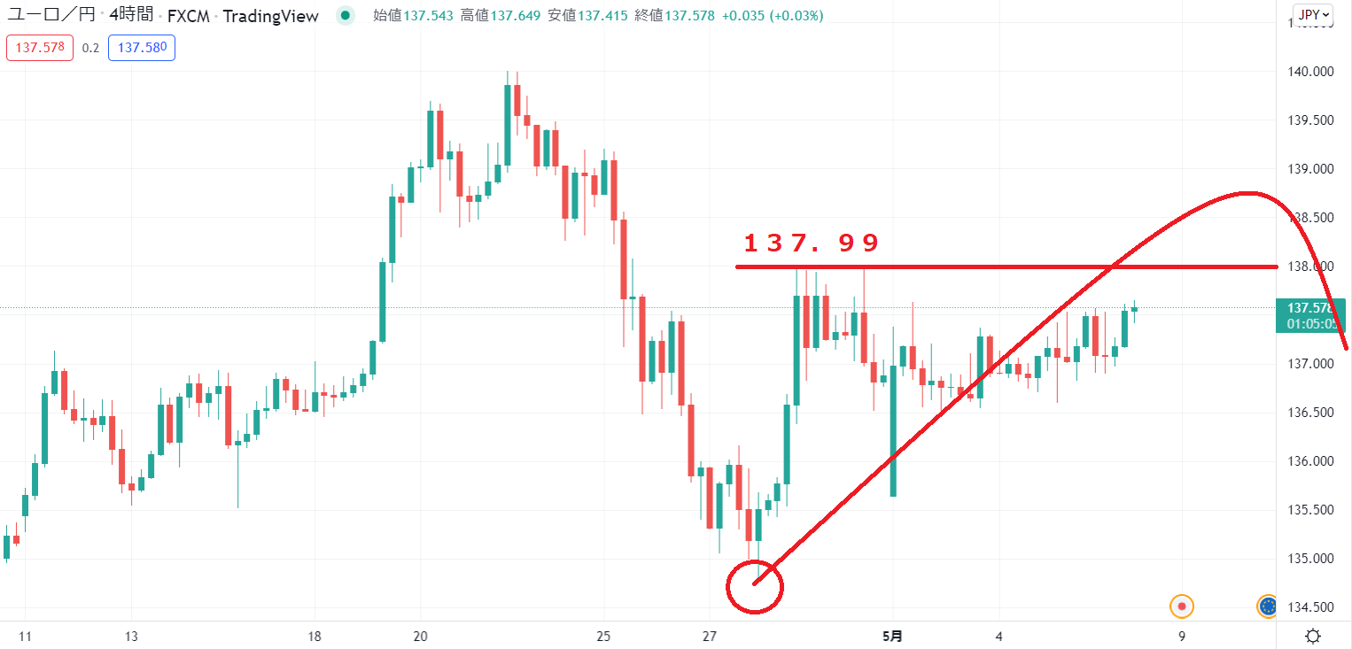 現在高値137.99、ここを超えるのか超えずに下落するのか、ということに今は注目しています。