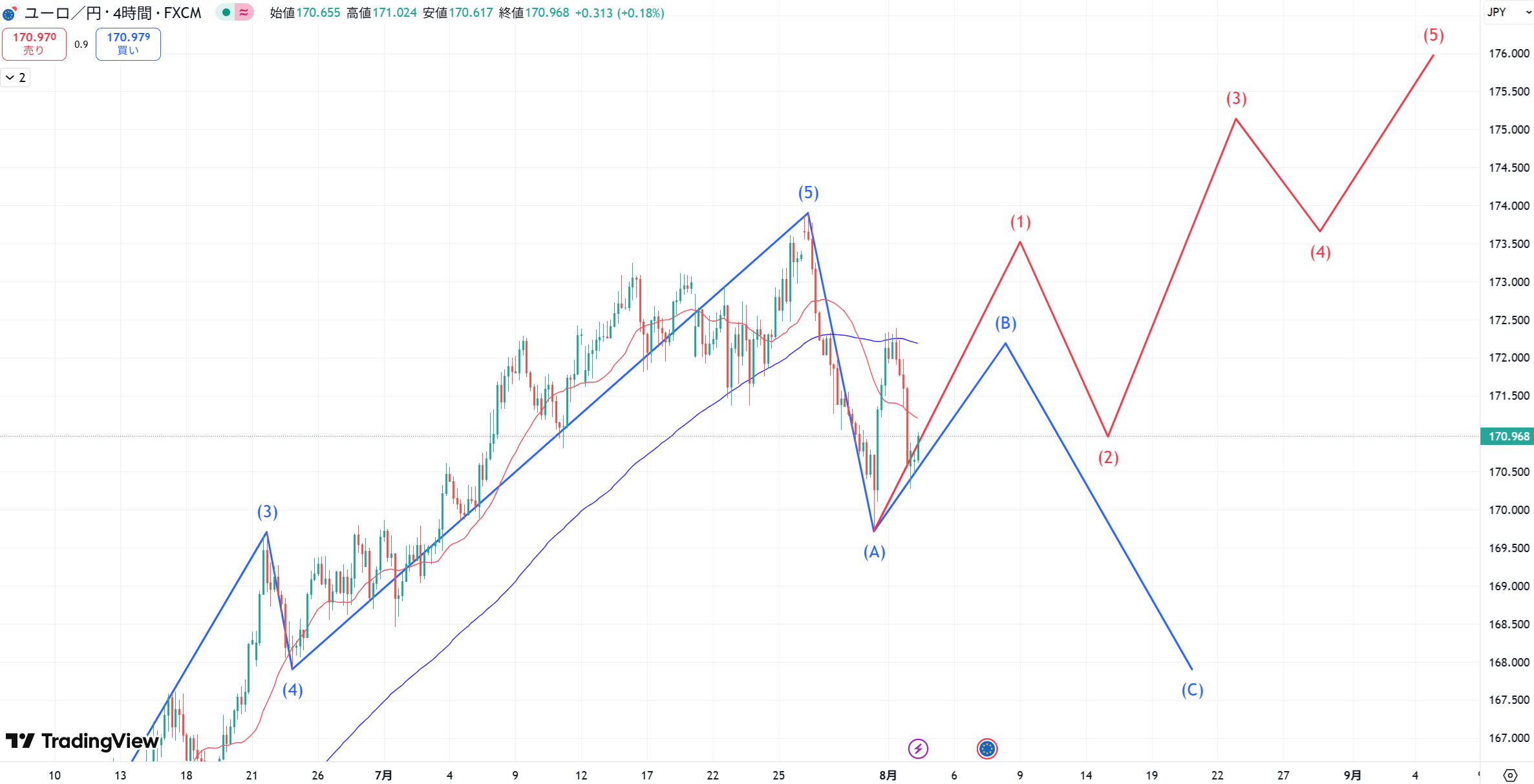 ユーロ円メジャーサイクルは赤のシナリオ24日目、または青のシナリオ13日目でみています。