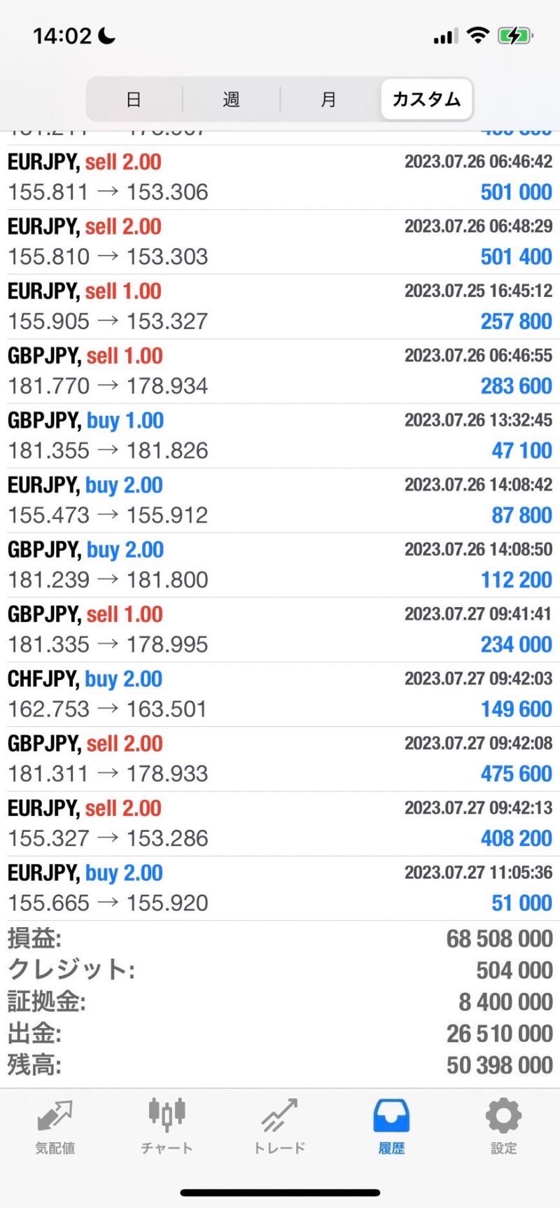私の直近のトレード履歴になりますが、+6850万円です。