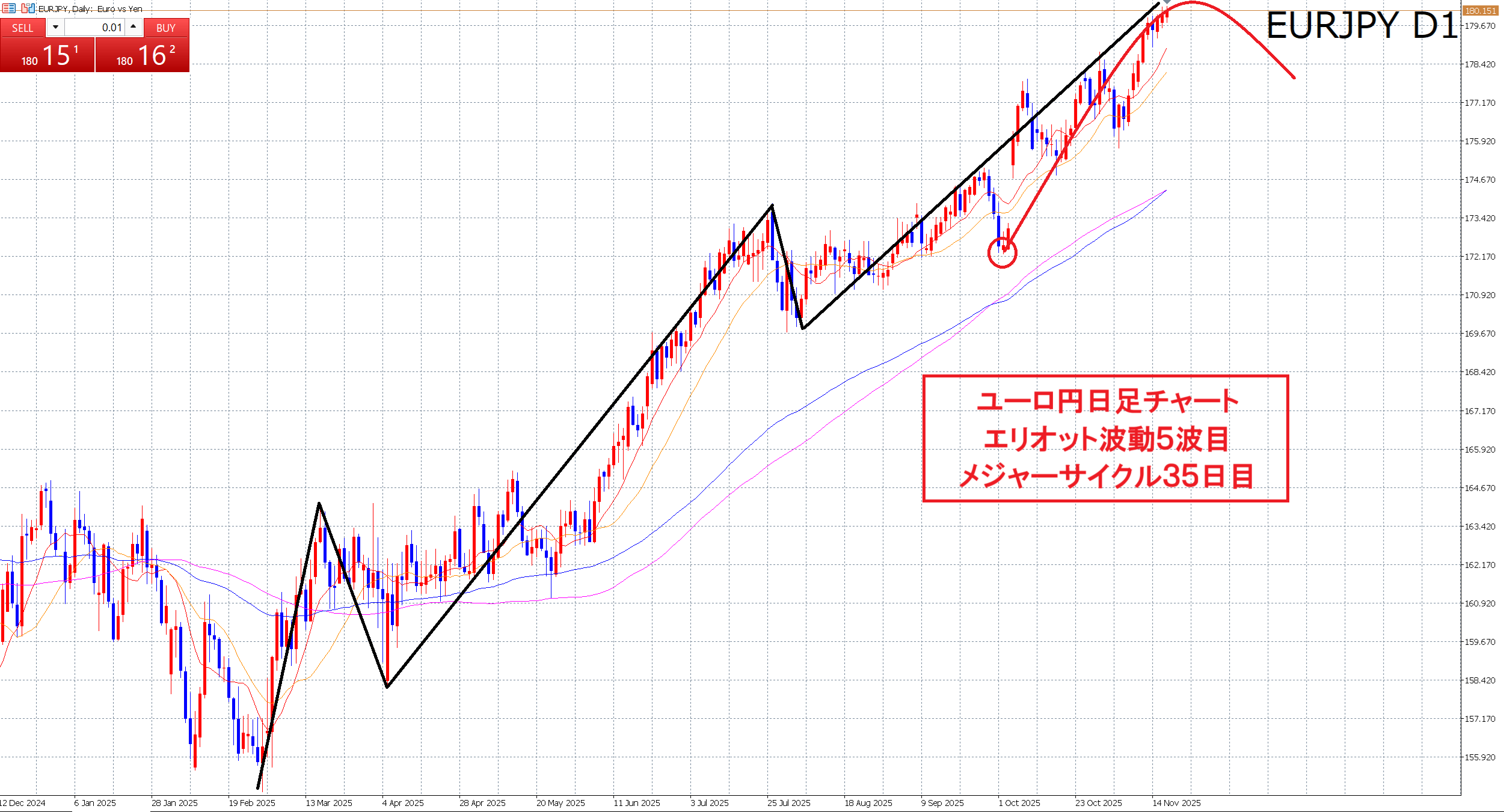 4Hサイクルスタートの可能性が高い状況は変わりませんが、日足上髭完成したので、サイクル継続中のシナリオについても入れておきます。